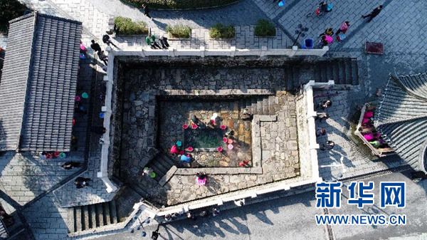 人們在江西宜春溫湯鎮(zhèn)的溫泉泉眼邊打水(2月28日無人機拍攝)。? 新華社記者 彭昭之 攝
