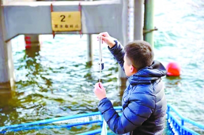 供水調度的正常開展,離不開水文人員的辛苦付出。早上8時許,懷柔水庫的氣溫在零下9攝氏度左右,水庫的水文取水點旁,京密引水管理處的水文人員李海春小心翼翼地順著臺階向水面走去,由于氣溫太低,臺階欄桿兩側已結了厚厚的冰柱,臺階上也因為積水成冰而變得異常濕滑。來到水邊,李海春掏出專業(yè)溫度計,順著繩子將它扔進水面?!盀榱藴y得更加準確,必須讓溫度計在里面至少待5分鐘?!崩詈4赫f。專業(yè)的水文溫度計有不銹鋼外表,可以抵擋零下十幾攝氏度的嚴寒。李海春雖然穿了羽絨服,但站在戶外,尤其是水邊,5分鐘也是相當?shù)碾y熬。