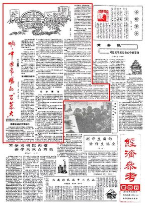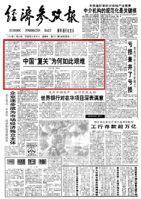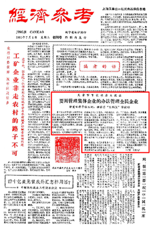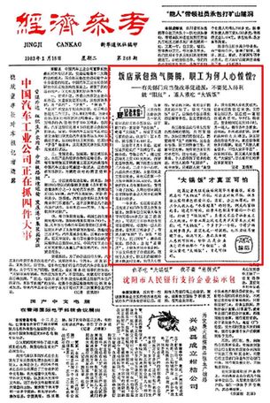 這是《經(jīng)濟(jì)參考報(bào)》的創(chuàng)刊號。在頭版《要用管理集體企業(yè)的辦法管理全民企業(yè)》一文中,時(shí)任天津市市長胡啟立表示,“吃大鍋飯”的經(jīng)濟(jì)管理體制已走進(jìn)死胡同。如果用管理集體企業(yè)的辦法來管理全民企業(yè),浪費(fèi)會(huì)大大減少,國家收入會(huì)大大增加,職工生活會(huì)大大改善,這是明擺著的事情。在這個(gè)問題上,誰覺悟得早誰主動(dòng);誰還在老框框里吃“大鍋飯”,誰就被動(dòng)。