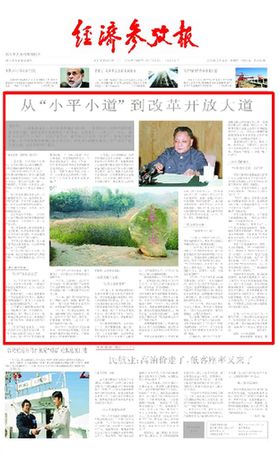 2008年,也是中國改革開放30周年,《經(jīng)濟(jì)參考報(bào)》刊發(fā)《從“小平小道”到改革開放大道》。當(dāng)年,受到錯(cuò)誤批判的鄧小平同志被疏散到江西新建縣拖拉機(jī)廠勞動(dòng)。在這條原本不是路、工友們?yōu)榱俗屗焕@遠(yuǎn)路而悄悄修整出來的田邊小路上,鄧小平徘徊了三年、思考了三年。當(dāng)鄧小平重新登上中國政治舞臺(tái)中心的時(shí)候,他帶領(lǐng)全國人民走上了一條沒有前人經(jīng)驗(yàn)借鑒的改革開放大道。