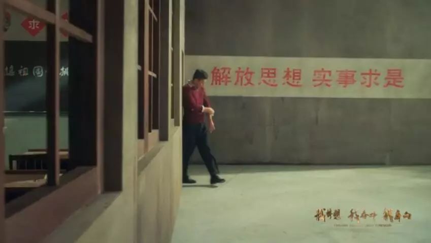??? 片中人們喜迎大會,共同分享這一紀念性的時刻,我們看到的背景墻上寫著“解放思想,實事求是”體現(xiàn)了時代精神。警察、郵遞員、工廠女工、老人、學(xué)生和年輕人的服裝,按照當年的樣式進行還原,并且全部進行重新制作,完全還原了當時的場景。