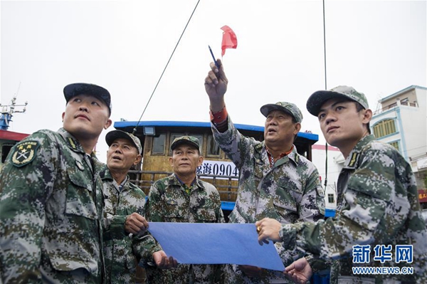 海南省瓊海市潭門鎮(zhèn),東面環(huán)海,南接博鰲,這里是王書茂的家鄉(xiāng)。史料記載,潭門漁民自秦代開始便世世代代在南海打魚,稱南海為“祖宗?!薄W鳛樘堕T海上民兵連副連長的王書茂,每年有一多半時間在海上度過,由于熟悉當?shù)厣缜槊袂?,他多次?zhí)行急難險重任務,每次都沖鋒在前,出色完成任務。44年的漁業(yè)生涯中,共組織漁民抵御臺風120多場,對600多位漁民實施了救援,還參加了多處南沙島礁的建設。“盡管危險,但我們從來沒有放棄過守護和耕耘南海。”王書茂說。