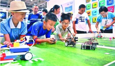 小學(xué)生在2018世界機(jī)器人大會(huì)一處展臺(tái)體驗(yàn)編程機(jī)器人。新華社發(fā)