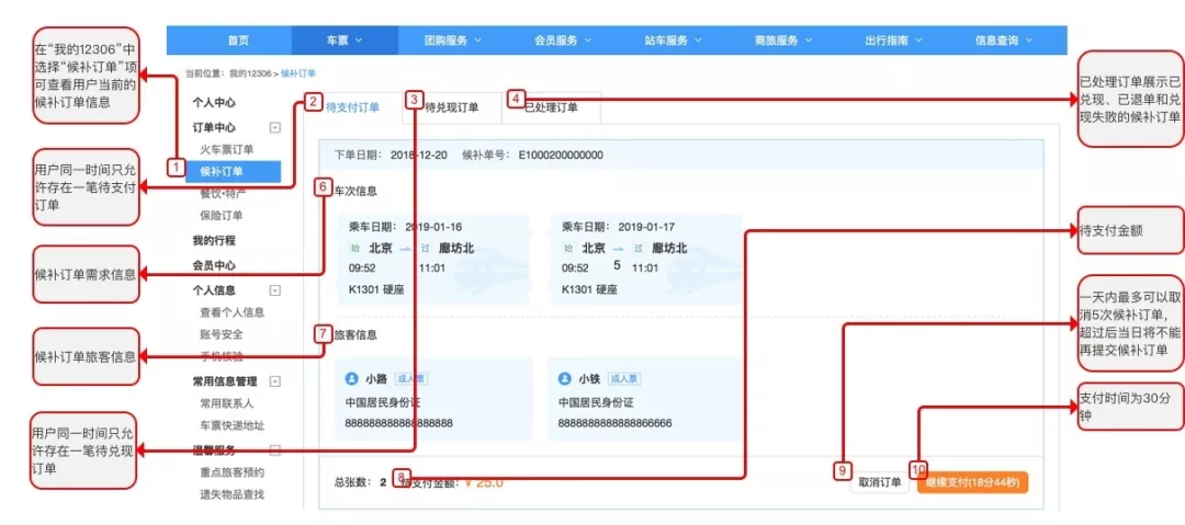 手機(jī)APP示意圖 候補(bǔ)訂單提交成功后需在30分鐘內(nèi)完成支付,完成候補(bǔ)預(yù)付款支付后,候補(bǔ)購票訂單立即生效。候補(bǔ)購票訂單生效后,相關(guān)候補(bǔ)需求不可修改,如需變更,可終止訂單后重新操作。兌現(xiàn)時(shí),按照候補(bǔ)訂單生效的時(shí)間順序,兌現(xiàn)符合條件的候補(bǔ)需求。預(yù)付款按該單不同組合需求中票款的最高額度計(jì)算(臥鋪按下鋪票價(jià)計(jì)算)。 候補(bǔ)購票預(yù)付款支付成功后,系統(tǒng)將持續(xù)嘗試為您兌現(xiàn)候補(bǔ)需求(同一候補(bǔ)需求不進(jìn)行部分兌現(xiàn)),若有匹配需求的車票,系統(tǒng)將自動(dòng)為您生成已支付訂單,預(yù)付款大于實(shí)際票款的,系統(tǒng)將自動(dòng)退回差額票款;若無匹配需求的車票,系統(tǒng)將在截止兌現(xiàn)時(shí)間自動(dòng)終止兌現(xiàn),用戶主動(dòng)終止或系統(tǒng)自動(dòng)終止候補(bǔ)的,系統(tǒng)自動(dòng)全額退還預(yù)付款。 兌現(xiàn)成功或自動(dòng)終止時(shí),將通過您選擇的通知方式進(jìn)行告知,請(qǐng)注意查收消息并關(guān)注“候補(bǔ)訂單”兌現(xiàn)狀態(tài)。兌現(xiàn)成功車票視為已購車票,退改簽按既有規(guī)則辦理。 劃重點(diǎn) 候補(bǔ)訂單提交成功后 需要在30分鐘內(nèi)完成支付 預(yù)付款按組合需求中票款最高額度計(jì)算 系統(tǒng)自動(dòng)退回差額票款 登錄12306.cn網(wǎng)站,在個(gè)人中心導(dǎo)航欄上點(diǎn)擊“候補(bǔ)訂單”可進(jìn)入訂單查看頁,候補(bǔ)訂單分為“待支付訂單”、“待兌現(xiàn)訂單”和“已處理訂單”三個(gè)選項(xiàng),其中“已處理訂單”包含已兌現(xiàn)、已退單和兌現(xiàn)失敗三種狀態(tài)訂單,已兌現(xiàn)表示候補(bǔ)需求兌現(xiàn)成功;已退單表示用戶主動(dòng)退單;兌現(xiàn)失敗表示候補(bǔ)需求兌現(xiàn)失敗,可能為車票數(shù)量不足、與實(shí)名制規(guī)定沖突等原因。