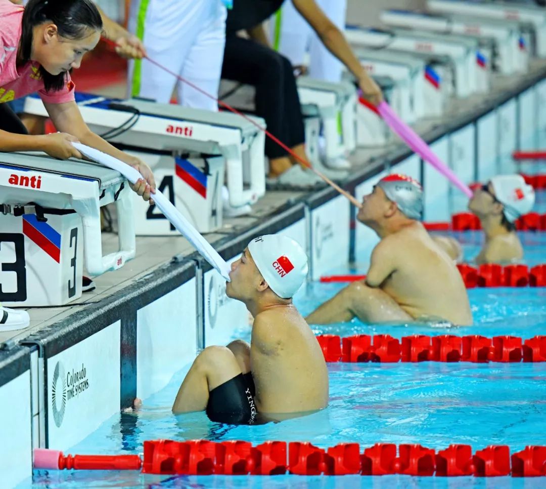 2018-08-28,廣東省肇慶市西江學(xué)院游泳館。三名重度殘障選手在游泳賽道上準(zhǔn)備一拼。當(dāng)日,廣東省第八屆殘疾人運動會游泳項目舉行決賽。作者:文兄言成