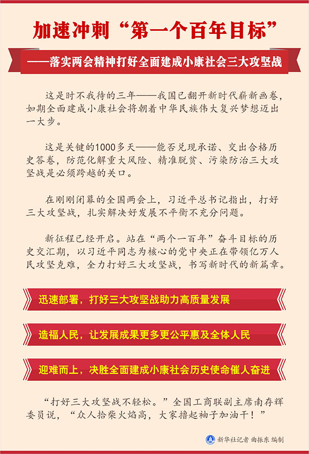 新華社北京3月29日電? 題:加速沖刺“第一個百年目標”——落實兩會精神打好全面建成小康社會三大攻堅戰(zhàn)