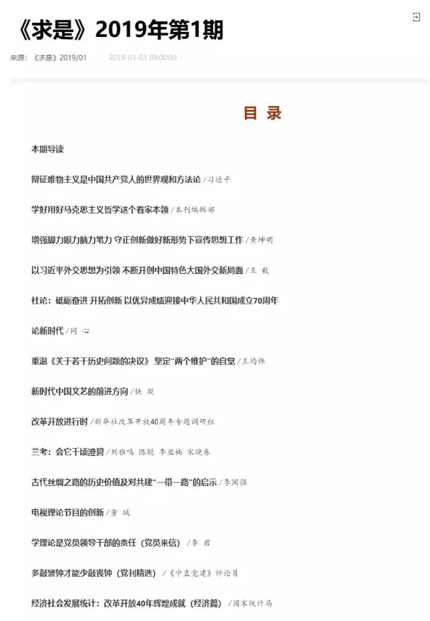 剛剛出版的2019年第1期首發(fā)了習(xí)近平總書(shū)記重要文章《辯證唯物主義是中國(guó)共產(chǎn)黨人的世界觀和方法論》,配發(fā)了學(xué)習(xí)習(xí)近平總書(shū)記重要文章的編輯部文章《學(xué)好用好馬克思主義哲學(xué)這個(gè)看家本領(lǐng)》。
