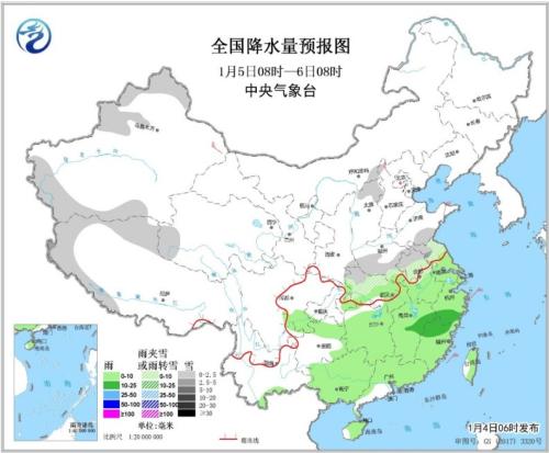 1月5日08時至6日08時,新疆北部和南疆盆地、西藏西部和北部、青海西部、山西北部、黃淮中南部、江淮北部、江漢中北部等地的部分地區(qū)有小雪或雨夾雪,局地中雪;四川盆地南部、江漢南部、江淮南部、江南、華南大部和臺灣島等地的部分地區(qū)有小到中雨。新疆東部和山東半島等地的部分地區(qū)有4~6級及以上風(見圖2)。