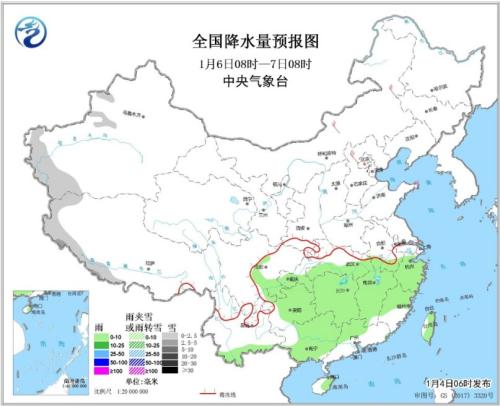 1月4日08時至5日08時,黑龍江中東部、北疆北部和南疆西部山區(qū)、青海中東部、西藏東部和西部、川西高原、陜西中南部、湖北西部、黃淮西部和東南部等地的部分地區(qū)有小雪或雨夾雪;江漢、江淮及其以南大部地區(qū)、西南地區(qū)東部和南部等地的部分地區(qū)有小到中雨,江西中北部、浙江中部和廣西東北部等地的部分地區(qū)有大雨(25~35毫米)。內蒙古中北部、黑龍江東北部、遼東半島和山東半島等地的部分地區(qū)有4~6級及以上風(見圖1)。北部灣、瓊州海峽、廣東西部沿岸部分海域將有大霧天氣。