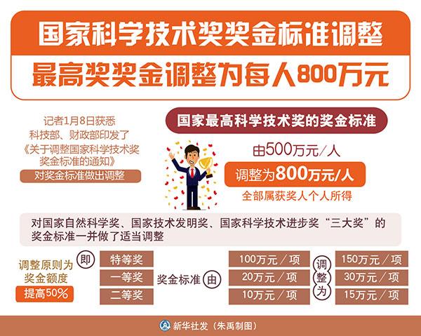 圖表:國(guó)家科學(xué)技術(shù)獎(jiǎng)獎(jiǎng)金標(biāo)準(zhǔn)調(diào)整 最高獎(jiǎng)獎(jiǎng)金調(diào)整為每人800萬(wàn)元 新華社發(fā) 朱禹 制圖