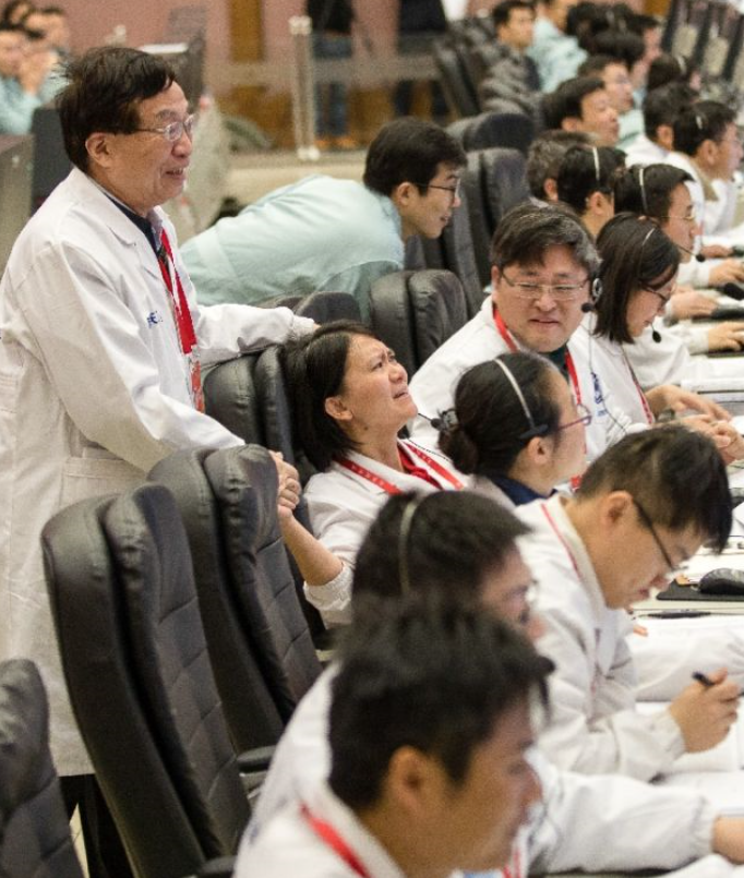 1月3日,嫦娥四號(hào)落月的一刻,74歲的中國(guó)航天科技集團(tuán)五院深空探測(cè)和空間科學(xué)首席科學(xué)家、嫦娥一號(hào)衛(wèi)星總設(shè)計(jì)師葉培建院士走向正在前排工作席的嫦娥四號(hào)探測(cè)器項(xiàng)目執(zhí)行總監(jiān)張熇,兩代“嫦娥人”的手,緊緊地握在了一起。新華社記者金立旺攝