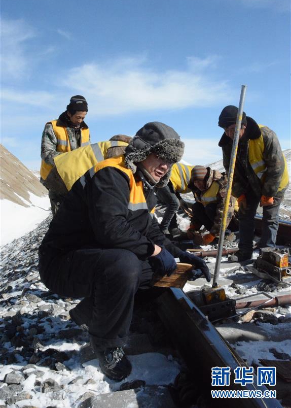 青藏鐵路格爾木工務(wù)段望昆線路養(yǎng)護(hù)車間副主任于本蕃(前)和工友進(jìn)行凍害墊板的鋪設(shè)作業(yè)(1月11日攝)。新華社發(fā)(王浡 攝)