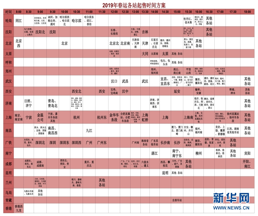圖為2019年春運(yùn)各站起售時間分配方案。(12306供圖)