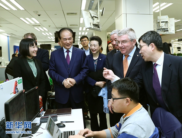 1月30日,新華社社長蔡名照在北京會見國際奧委會主席巴赫。這是蔡名照陪同巴赫參觀新華社新聞信息發(fā)稿中心。新華社記者 鞠鵬 攝