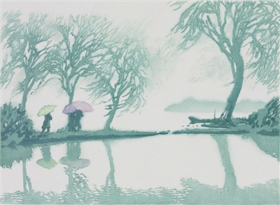 浙江美術(shù)館藏陸放版畫《西湖春雨》。