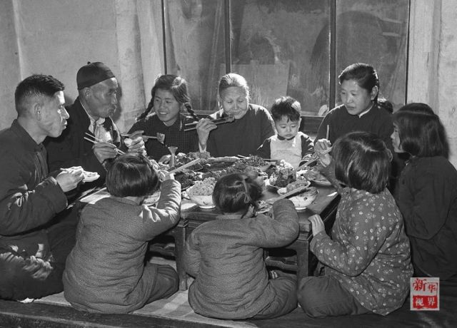 ↑1953年,天津市漢沽區(qū)蘆臺(tái)王德鑄(左一)一家吃團(tuán)圓飯。