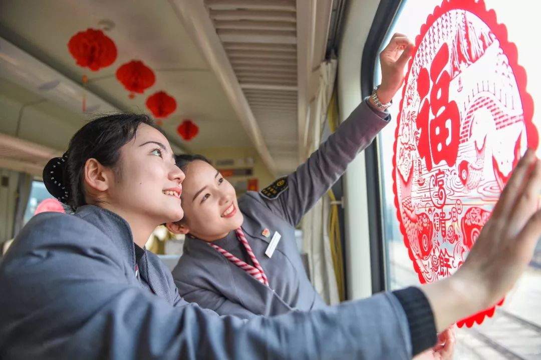 2019-01-29,江西省南昌市。南昌至北京西的Z68次列車上,乘務員在車上貼上窗花,為旅客準備免費書籍、玩具和春節(jié)物品等,營造濃濃的年味兒。作者:清風吹過60年