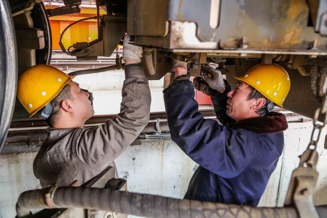 2019-02-08,唐山機務段。大年初四,唐山機務段的整備人員正在檢修機車走行部,確保出庫機車質量良好。作者:樂亭閑人