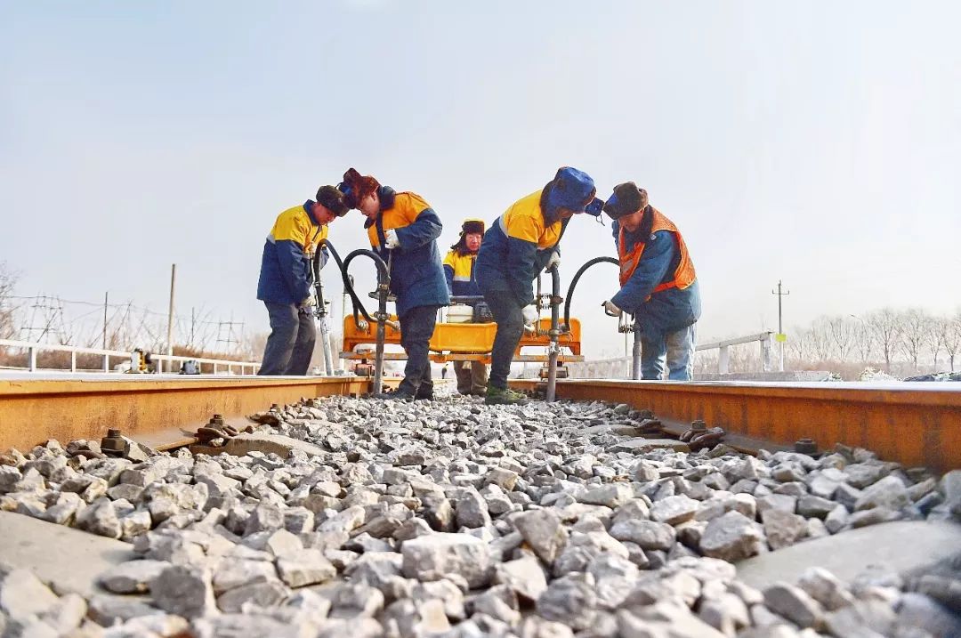 2019-02-06,河北省唐山市。北京局鐵路集團公司所轄的七灤線上,工務工人正在搗固線路,確保春運行車安全。作者:養(yǎng)路工