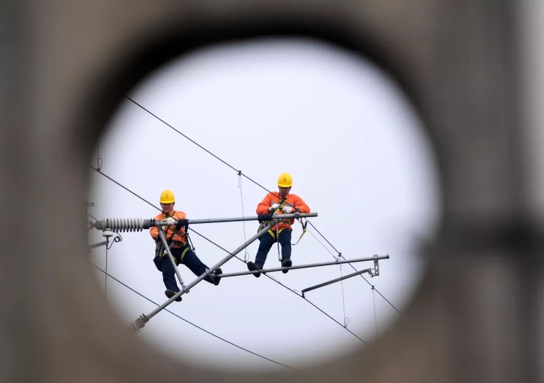 2019-02-06,江西九江。中國鐵路南昌局集團有限公司南昌供電段的職工在武九鐵路瑞昌區(qū)段檢修保養(yǎng)接觸網(wǎng)設備,以迎接節(jié)后鐵路運輸高峰。作者:江山如畫