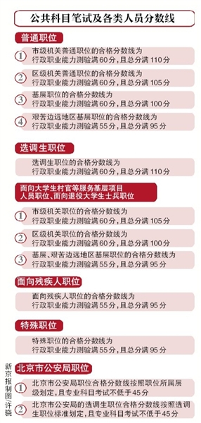 1 市級機關普通職位的合格分數(shù)線為:行政職業(yè)能力測驗滿60分,且總分滿110分