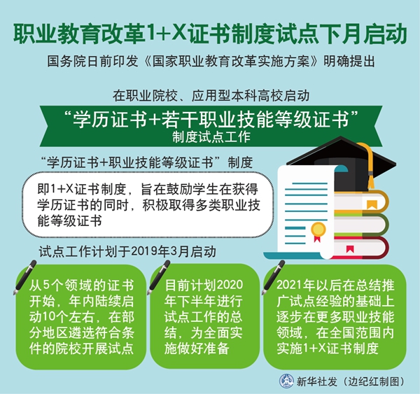 “職教20條”提出,從2019年開始,在職業(yè)院校、應用型本科高校啟動“學歷證書+若干職業(yè)技能等級證書”制度試點(以下稱1+X證書制度試點)工作。試點工作要進一步發(fā)揮好學歷證書作用,夯實學生可持續(xù)發(fā)展基礎,鼓勵職業(yè)院校學生在獲得學歷證書的同時,積極取得多類職業(yè)技能等級證書,提高就業(yè)創(chuàng)業(yè)本領(lǐng),緩解結(jié)構(gòu)性就業(yè)矛盾。