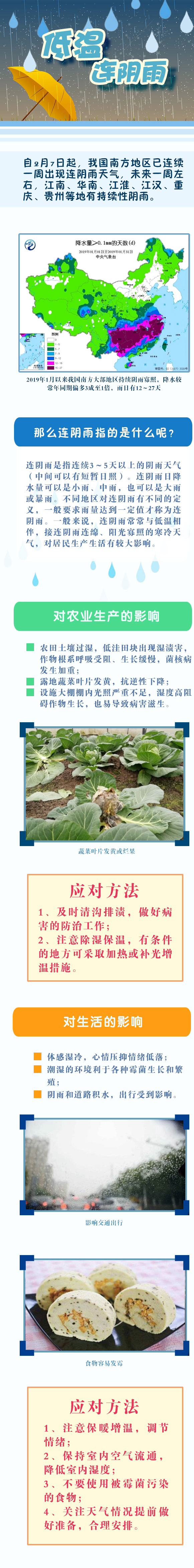 氣象專家表示,持續(xù)陰雨寡照和階段性低溫天氣對南方地區(qū)生產(chǎn)生活、交通運輸、人體健康等造成一定影響,特別是對農(nóng)業(yè)生產(chǎn)的影響較大。油菜、蔬菜遭受濕漬害,長勢偏弱,露地蔬菜產(chǎn)量下降。設(shè)施大棚光照不足,果蔬產(chǎn)量和品質(zhì)都下降。