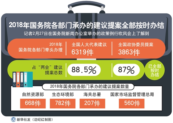 新華社北京2月27日電(胡璐、張涵)2018年,國(guó)務(wù)院各部門牽頭辦理全國(guó)人大代表建議6319件,全國(guó)政協(xié)委員提案3863件,分別占“兩會(huì)”建議提案總數(shù)的88.5%和87%,已全部按時(shí)辦結(jié)。
