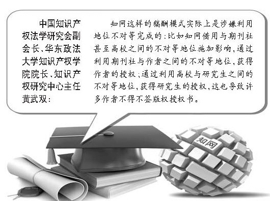 中國知識產(chǎn)權(quán)法學(xué)研究會副會長、華東政法大學(xué)知識產(chǎn)權(quán)學(xué)院院長、知識產(chǎn)權(quán)研究中心主任黃武雙告訴記者,知網(wǎng)這樣的稿酬模式實際上是涉嫌利用地位不對等完成的:比如知網(wǎng)借用與期刊社甚至高校之間的不對等地位施加影響,通過利用期刊社與作者之間的不對等地位,獲得作者的授權(quán);通過利用高校與研究生之間的不對等地位,獲得研究生的授權(quán),這也導(dǎo)致許多作者不得不簽版權(quán)授權(quán)書。