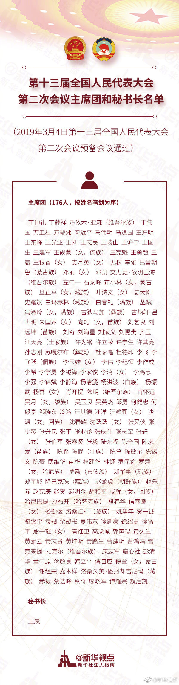 第十三屆全國人民代表大會第二次會議主席團(tuán)和秘書長名單