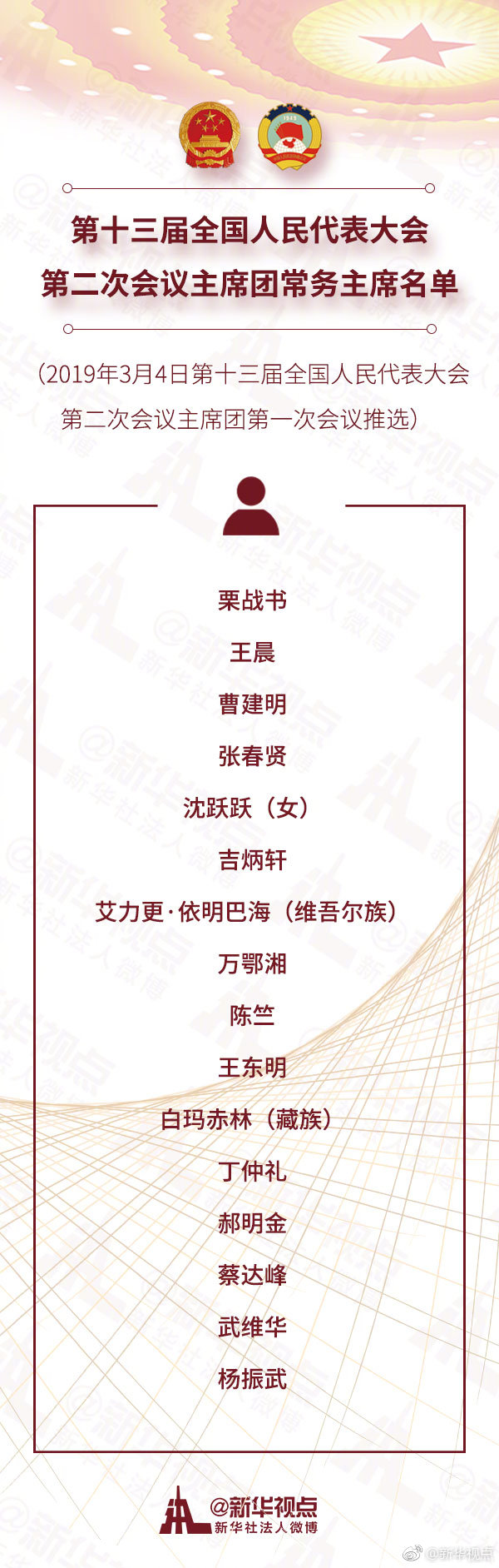 栗戰(zhàn)書(shū) 王晨 曹建明 張春賢 沈躍躍(女) 吉炳軒 艾力更·依明巴海(維吾爾族) 萬(wàn)鄂湘 陳竺 王東明 白瑪赤林(藏族) 丁仲禮 郝明金 蔡達(dá)峰 武維華 楊振武