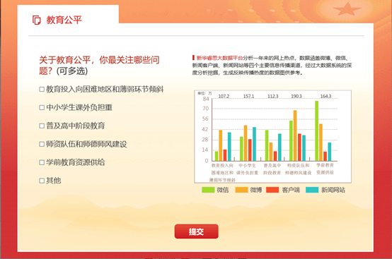在新華網(wǎng)推出的2019全國(guó)兩會(huì)熱點(diǎn)調(diào)查中,教育公平位居榜首,截至目前,關(guān)注度占比9.17%,成為網(wǎng)民兩會(huì)期間最關(guān)心的話題。