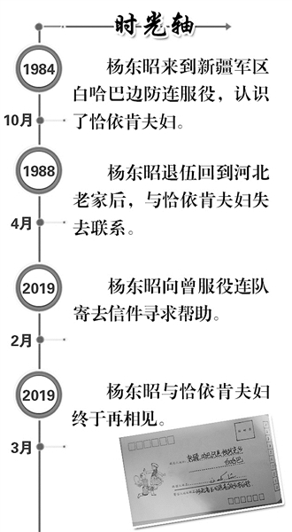隨著時(shí)間的推移,楊東昭這個(gè)當(dāng)年20歲的小伙子如今已年過半百,雖然日子過得越來越紅火,但內(nèi)心對(duì)兩位哈薩克族老人的思念越發(fā)強(qiáng)烈。在千家萬(wàn)戶團(tuán)聚歡樂的鞭炮聲中,他提筆寫了一封信寄到曾經(jīng)服役的連隊(duì)尋求幫助。