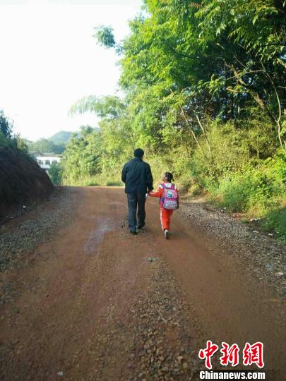 愛心志愿者康雄牽著“事實孤兒”去上學的背景。 長沙市岳麓區(qū)大愛無疆公益文化促進會供圖 攝