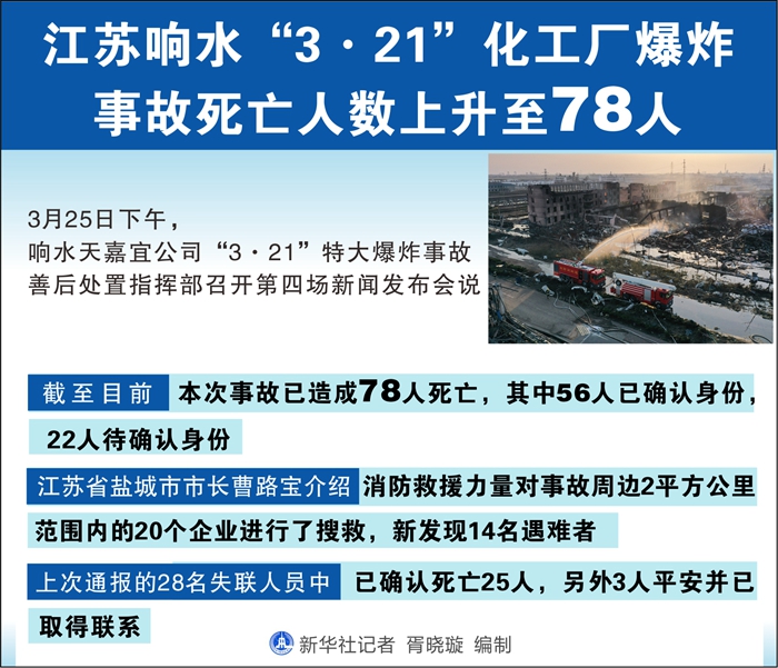 新華社響水3月25日電(記者朱國(guó)亮)25日下午,響水天嘉宜公司“3·21”特大爆炸事故善后處置指揮部召開第四場(chǎng)新聞發(fā)布會(huì)說,截至目前,本次事故死亡人數(shù)上升至78人。