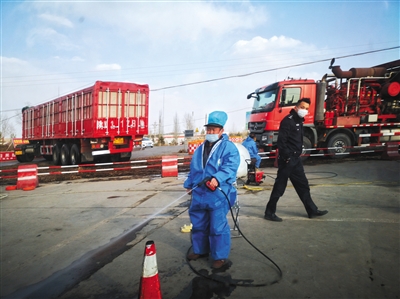 陜西省榆林市靖邊縣發(fā)生非洲豬瘟疫情后,3月9日,靖邊張家畔一公路交叉口,工作人員在交警配合下,對(duì)過往車輛噴灑消毒液。 圖/視覺中國(guó)