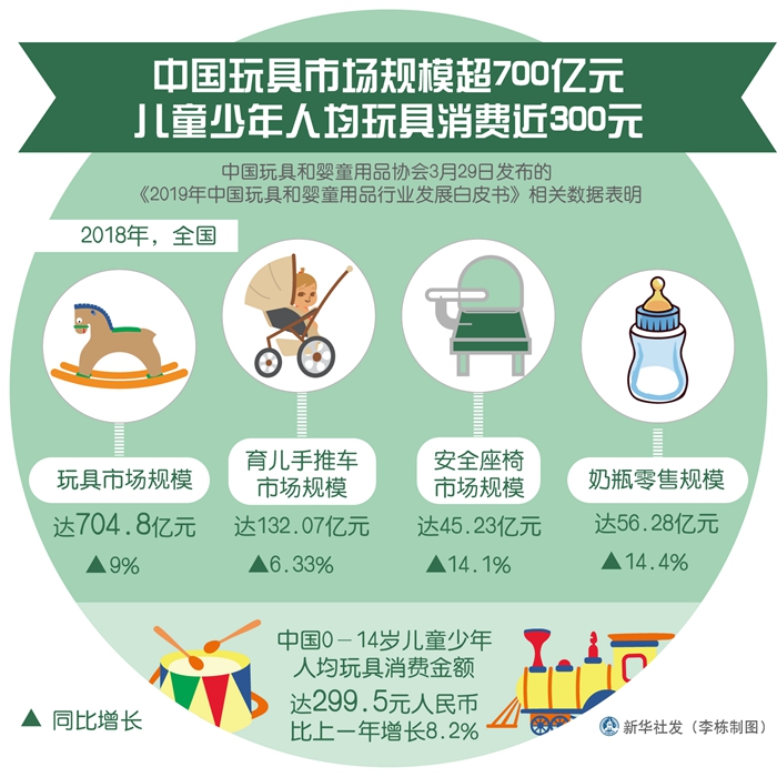 新華社上海3月29日電(記者 吳宇)2018年,中國(guó)0-14歲兒童少年人均玩具消費(fèi)金額達(dá)299.5元人民幣,比上一年增長(zhǎng)8.2%;2019年,中國(guó)65.6%的消費(fèi)者計(jì)劃增加玩具消費(fèi)支出,63.9%的消費(fèi)者計(jì)劃增加?jì)胪闷废M(fèi)支出。