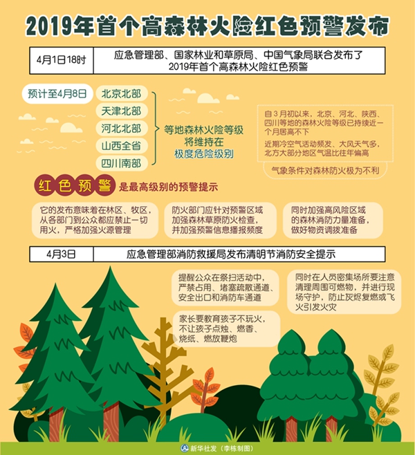 “此次紅色預(yù)警是三部門綜合考慮氣象條件、林區(qū)物候及衛(wèi)星林火監(jiān)測(cè)、清明節(jié)期間祭掃影響等情況,經(jīng)過會(huì)商研判共同發(fā)布的。”中國氣象局公共氣象服務(wù)中心副首席楊曉丹說,自3月初以來,北京、河北、陜西、四川等地的森林火險(xiǎn)等級(jí)一直居高不下,已持續(xù)近一個(gè)月;近期冷空氣活動(dòng)頻發(fā)、大風(fēng)天氣多,北方大部分地區(qū)氣溫比往年偏高,氣象條件對(duì)森林防火極為不利。