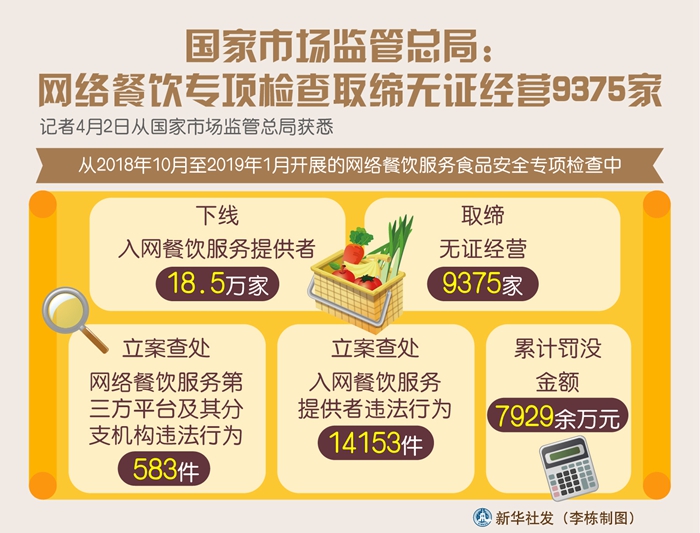 新華社北京4月2日電(記者趙文君)記者2日從國家市場監(jiān)管總局獲悉,在近期開展的網絡餐飲服務食品安全專項檢查中,下線入網餐飲服務提供者18.5萬家,取締無證經營9375家。