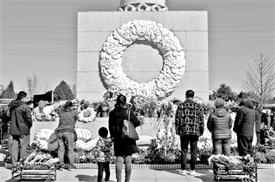 家屬手捧鮮花,在北京長青生命紀念園生態(tài)葬紀念碑前祭奠逝者 攝影/本報記者 魏彤