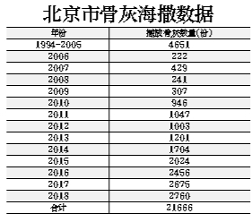 骨灰海葬是指將骨灰撒入大海,也是一種不保留骨灰的安葬方式。本市自1994年起推行骨灰海葬,率先制定了《北京市地方標準——骨灰撒海服務規(guī)范》(DB11/T 664—2009),建立了以47項標準為核心內容的骨灰海葬服務標準體系。從1994年到2018年,共舉辦485批次骨灰撒?;顒?,2.18萬余份骨灰投入到大海的懷抱。通過多年的骨灰海葬活動,形成了“全免費、四便利、兩公祭”的骨灰海葬服務模式,作為一種不占地、不保留骨灰的生態(tài)葬式,骨灰海葬已逐漸被更多的人接受。