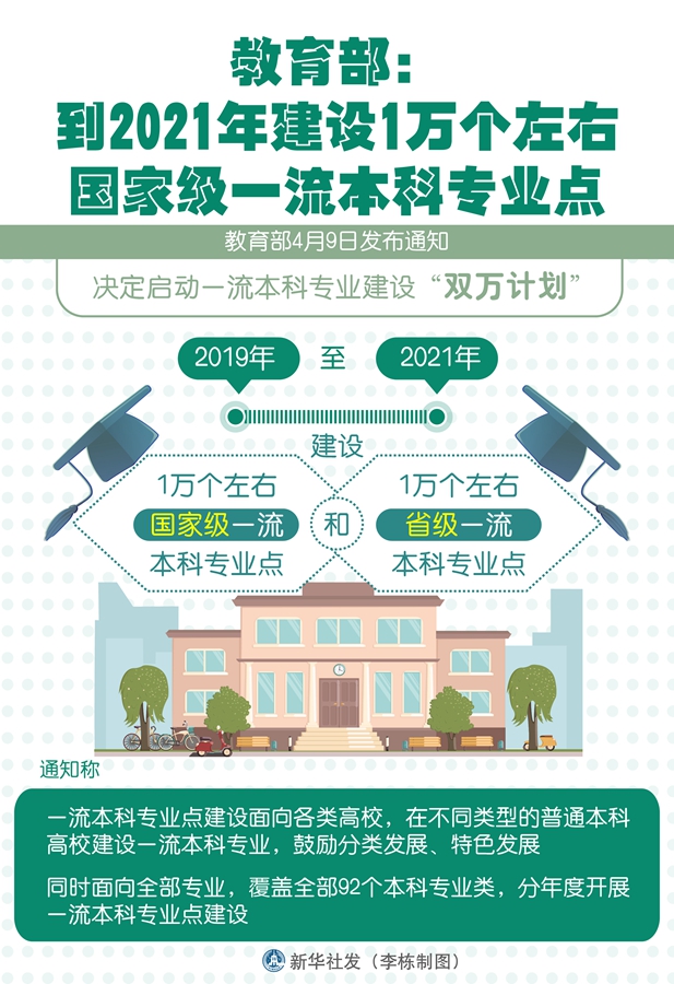 新華社北京4月9日電(記者施雨岑)教育部9日發(fā)布通知,決定啟動一流本科專業(yè)建設(shè)“雙萬計劃”,2019年至2021年建設(shè)1萬個左右國家級一流本科專業(yè)點和1萬個左右省級一流本科專業(yè)點。