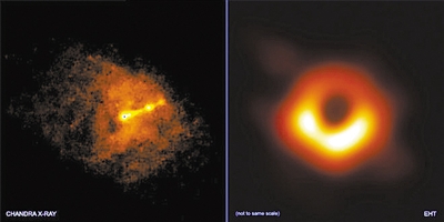 左圖 錢(qián)德拉X射線望遠(yuǎn)鏡與事件視界望遠(yuǎn)鏡同時(shí)拍攝的照片,顯示了M87星系中心黑洞的“相對(duì)論性噴流”。右圖 事件視界望遠(yuǎn)鏡拍攝的M87星系中心黑洞圖像。圖片來(lái)源:美國(guó)趣味科學(xué)網(wǎng)站