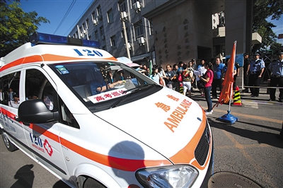 2015年6月,一輛120救護(hù)車在高考考場外隨時(shí)待命。資料圖片/新京報(bào)記者 王貴彬 攝