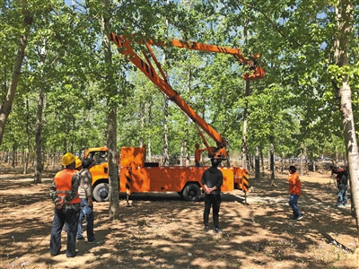 園林工人在修剪高處的楊樹枝條。新京報記者 周依 攝