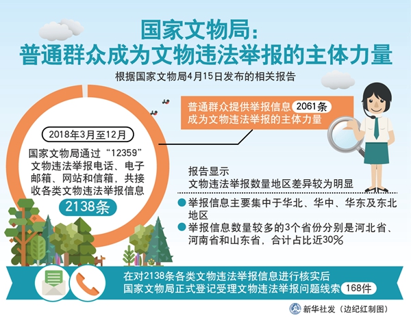 新華社北京4月15日電(記者施雨岑)根據(jù)國家文物局15日發(fā)布的相關(guān)報(bào)告,2018年3月至12月,國家文物局通過“12359”文物違法舉報(bào)電話、電子郵箱、網(wǎng)站和信箱,共接收各類文物違法舉報(bào)信息2138條。普通群眾提供舉報(bào)信息2061條,成為文物違法舉報(bào)的主體力量。
