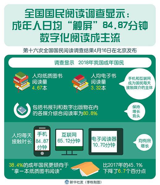 新華社北京4月16日電(記者 史競男)第十六次全國國民閱讀調(diào)查結(jié)果16日在京發(fā)布。調(diào)查顯示,2018年我國成年國民人均紙質(zhì)圖書閱讀量為4.67本、電子書閱讀量為3.32本,手機(jī)和互聯(lián)網(wǎng)成為國民每天接觸媒介的主體,紙質(zhì)書報(bào)刊的閱讀時(shí)長均有所減少。