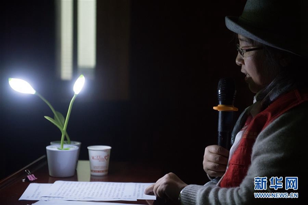 又到一次電影放映的日子。吳素環(huán)坐在放映室靠近屏幕的一個角落,右手握著話筒、左手撐在下方,在一個多小時的電影播放過程中,保持住話筒不搖晃。在微弱的臺燈燈光下,她時而抑揚(yáng)頓挫地讀著解說稿,時而抬起頭看看放映屏幕。