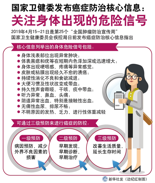 圖表:國(guó)家衛(wèi)健委發(fā)布癌癥防治核心信息:關(guān)注身體出現(xiàn)的危險(xiǎn)信號(hào) 新華社發(fā) 邊紀(jì)紅 制圖