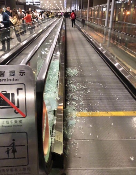 從許多微博大V和網(wǎng)友貼出的“受傷”步行自動扶梯照片來看,步行扶梯玻璃護(hù)欄碎了一地,一旁正是人山人海的接機(jī)粉絲。